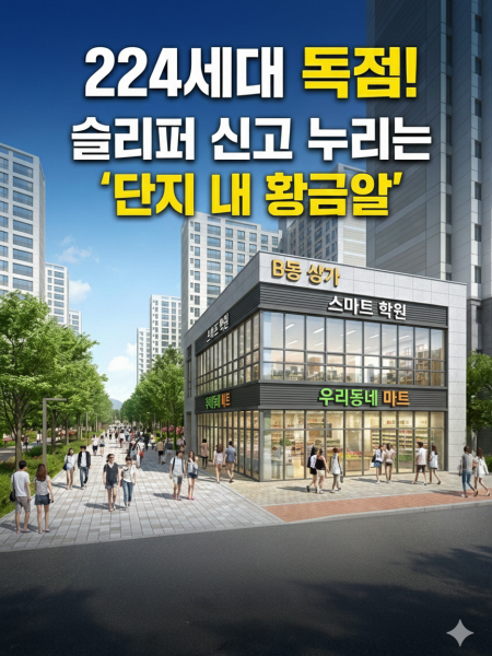 • 224세대 독점! 슬리퍼 신고 누리는 '단지 내 황금알' 🏆. 입주민들이 마트 가고 학원 갈 때 반드시 거쳐야 하는 길목. B동 상가는 경쟁자 없이 224세대 고정 고객을 독점하는 알짜배기 생활 밀착형 상가입니다. 놓치지 마세요!